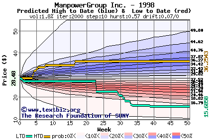 The high to date and low to date prices of the stock plotted against a random walk model for 1998 (what's this?).