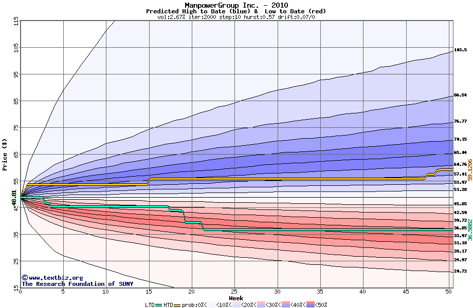 The high to date and low to date prices of the stock plotted against a random walk model for 2010 (what's this?).