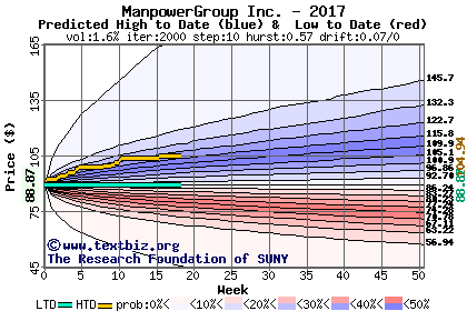 The high to date and low to date prices of the stock plotted against a random walk model for 2017 (what's this?).