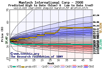 The high to date and low to date prices of the stock plotted against a random walk model for 2008 (what's this?).