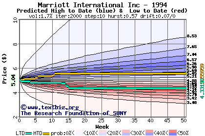 The high to date and low to date prices of the stock plotted against a random walk model for 1994 (what's this?).