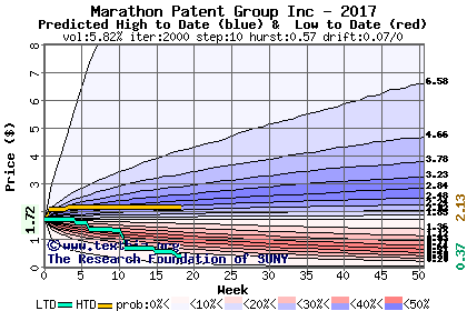 The high to date and low to date prices of the stock plotted against a random walk model for 2017 (what's this?).