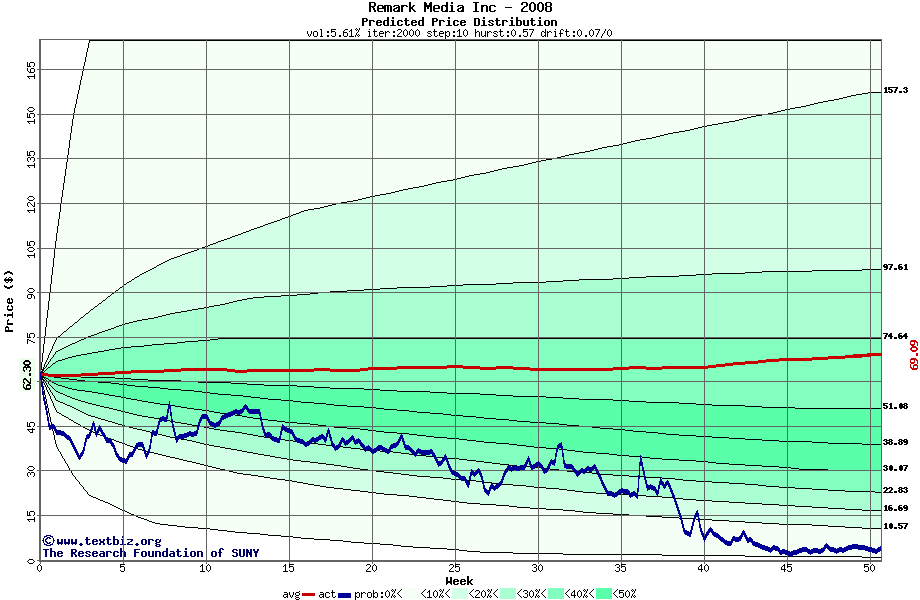 The following graph plots the year-to-date performance of the stock for 2008 compared to the probability calculated by a random walk model.