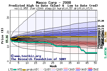 The high to date and low to date prices of the stock plotted against a random walk model for 2008 (what's this?).