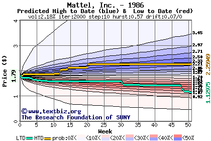 The high to date and low to date prices of the stock plotted against a random walk model for 1986 (what's this?).
