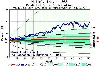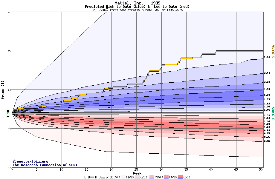 The high to date and low to date prices of the stock plotted against a random walk model for 1989 (what's this?).