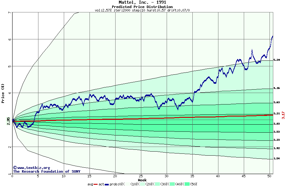 The following graph plots the year-to-date performance of the stock for 1991 compared to the probability calculated by a random walk model.