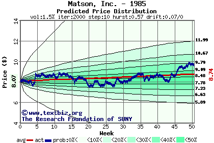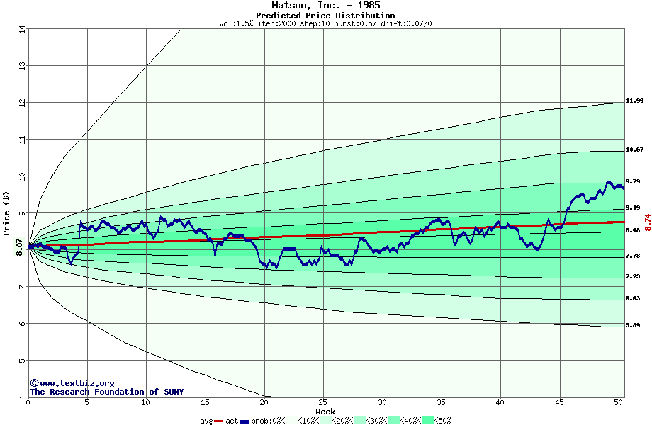 The following graph plots the year-to-date performance of the stock for 1985 compared to the probability calculated by a random walk model.