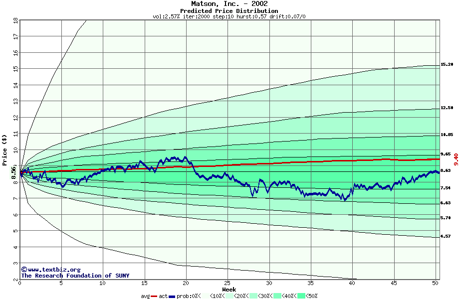 The following graph plots the year-to-date performance of the stock for 2002 compared to the probability calculated by a random walk model.
