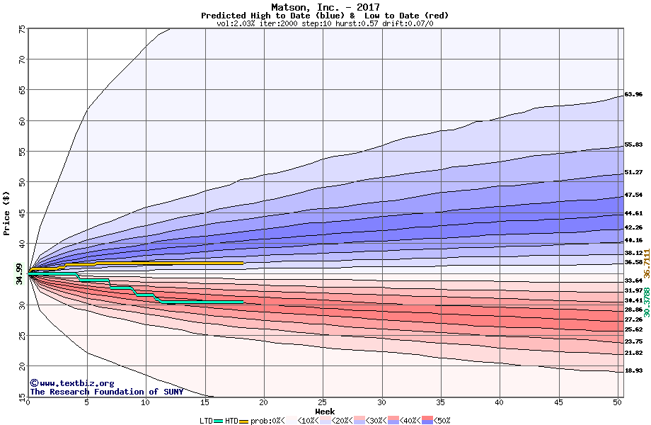 The high to date and low to date prices of the stock plotted against a random walk model for 2017 (what's this?).