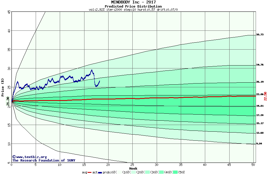 The high to date and low to date prices of the stock plotted against a random walk model for 2017 (what's this?).