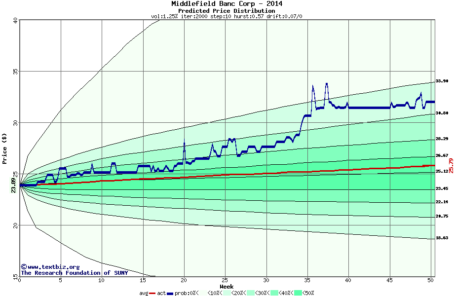The following graph plots the year-to-date performance of the stock for 2014 compared to the probability calculated by a random walk model.
