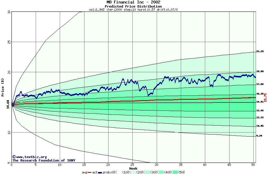 The following graph plots the year-to-date performance of the stock for 2002 compared to the probability calculated by a random walk model.