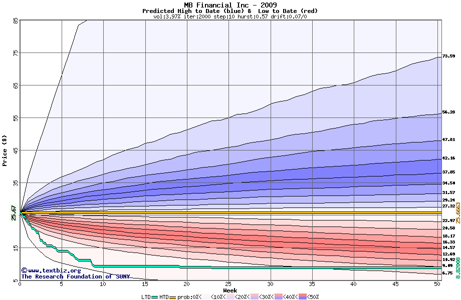 The high to date and low to date prices of the stock plotted against a random walk model for 2009 (what's this?).