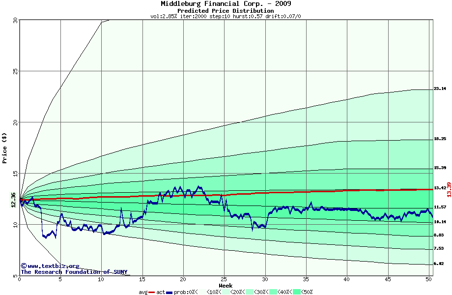 The following graph plots the year-to-date performance of the stock for 2009 compared to the probability calculated by a random walk model.