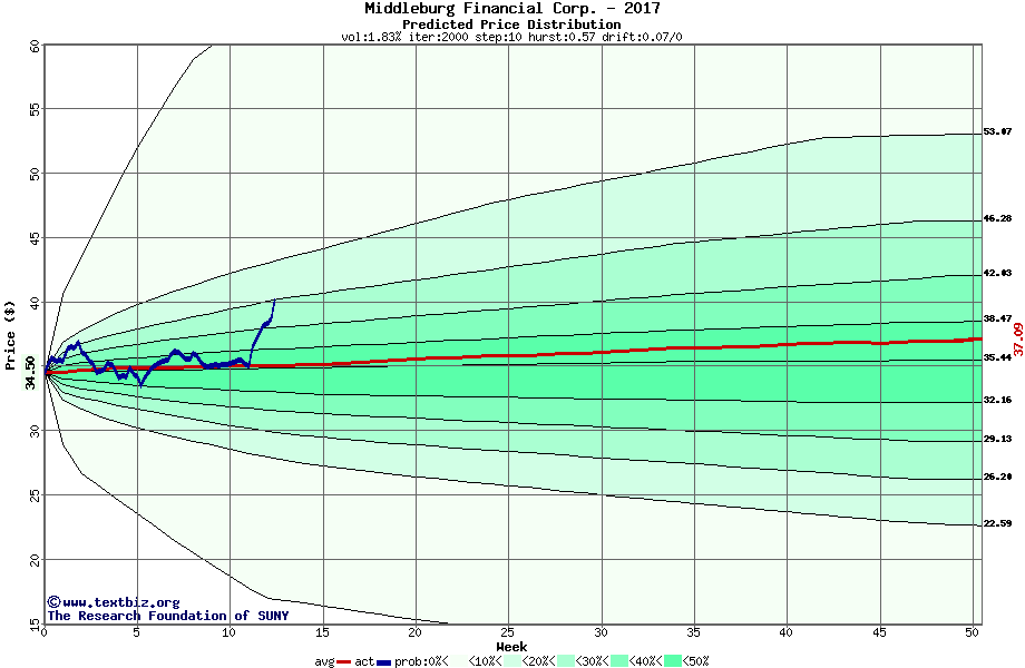 The following graph plots the year-to-date performance of the stock for 2017 compared to the probability calculated by a random walk model.
