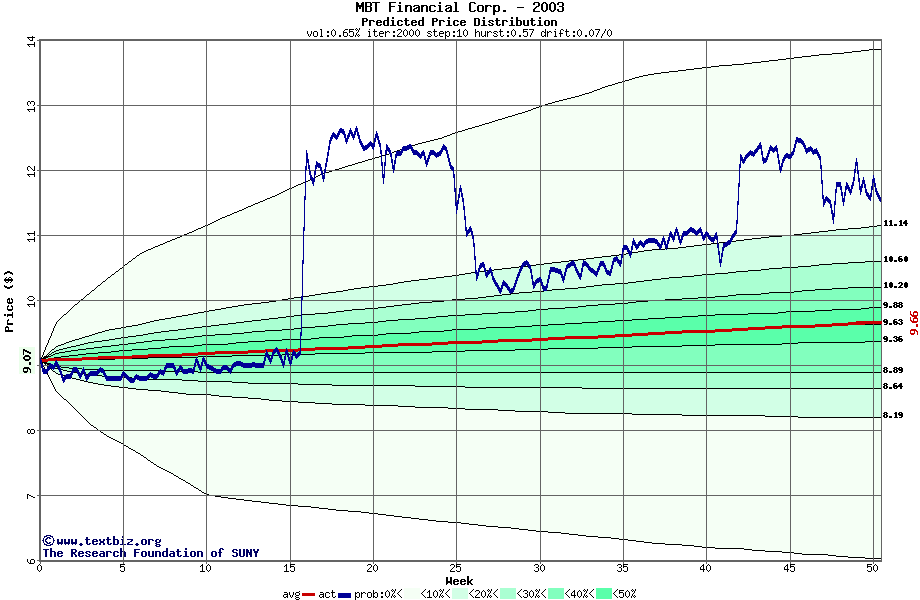 The following graph plots the year-to-date performance of the stock for 2003 compared to the probability calculated by a random walk model.