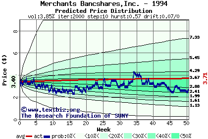The high to date and low to date prices of the stock plotted against a random walk model for 1994 (what's this?).