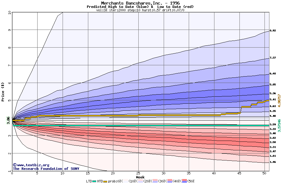 The high to date and low to date prices of the stock plotted against a random walk model for 1996 (what's this?).