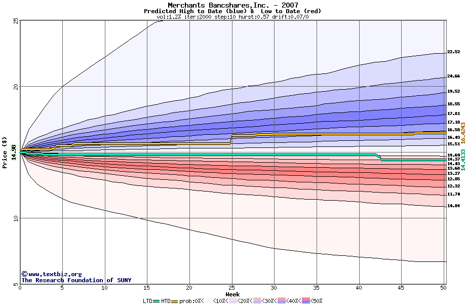 The high to date and low to date prices of the stock plotted against a random walk model for 2007 (what's this?).