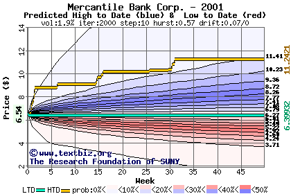 The high to date and low to date prices of the stock plotted against a random walk model for 2001 (what's this?).