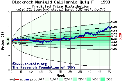 The high to date and low to date prices of the stock plotted against a random walk model for 1998 (what's this?).