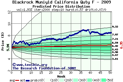 The high to date and low to date prices of the stock plotted against a random walk model for 2009 (what's this?).