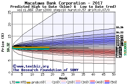 The high to date and low to date prices of the stock plotted against a random walk model for 2017 (what's this?).