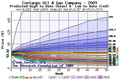 The high to date and low to date prices of the stock plotted against a random walk model for 2009 (what's this?).