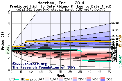 The high to date and low to date prices of the stock plotted against a random walk model for 2014 (what's this?).