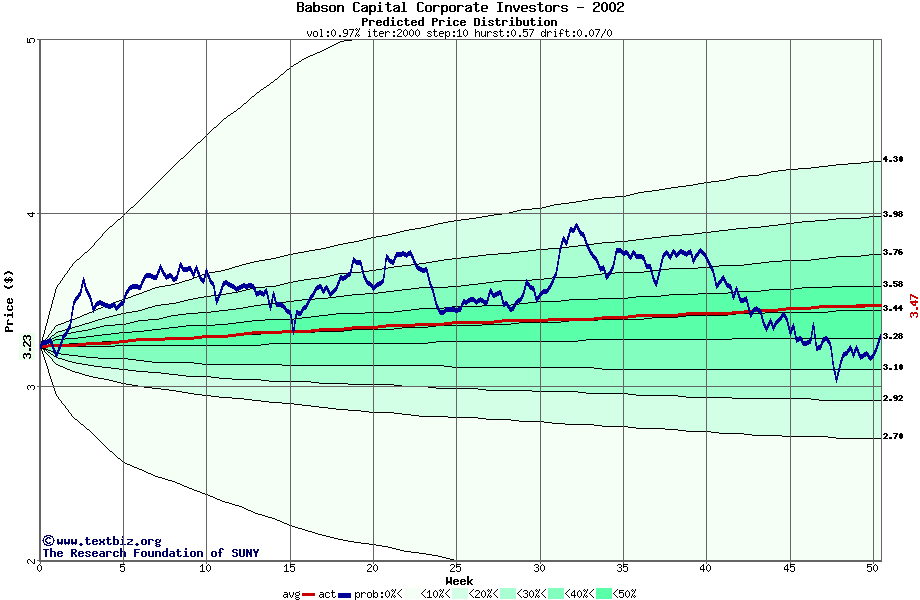 The following graph plots the year-to-date performance of the stock for 2002 compared to the probability calculated by a random walk model.