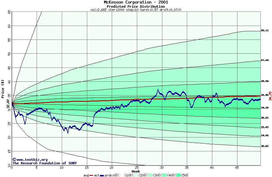 The following graph plots the year-to-date performance of the stock for 2001 compared to the probability calculated by a random walk model.