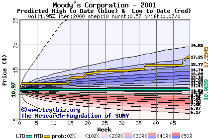 The high to date and low to date prices of the stock plotted against a random walk model for 2001 (what's this?).