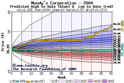 The high to date and low to date prices of the stock plotted against a random walk model for 2004 (what's this?).