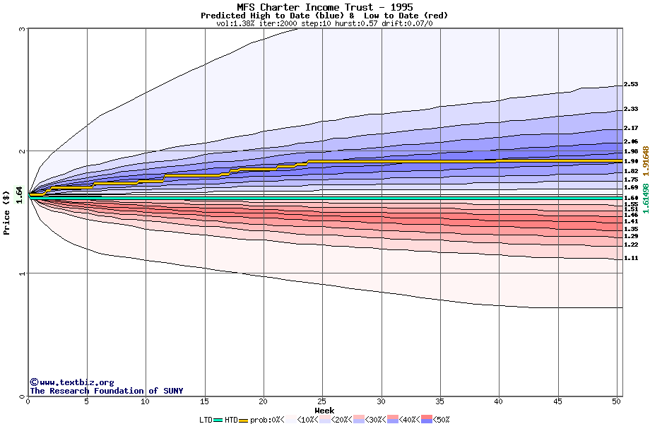 The high to date and low to date prices of the stock plotted against a random walk model for 1995 (what's this?).