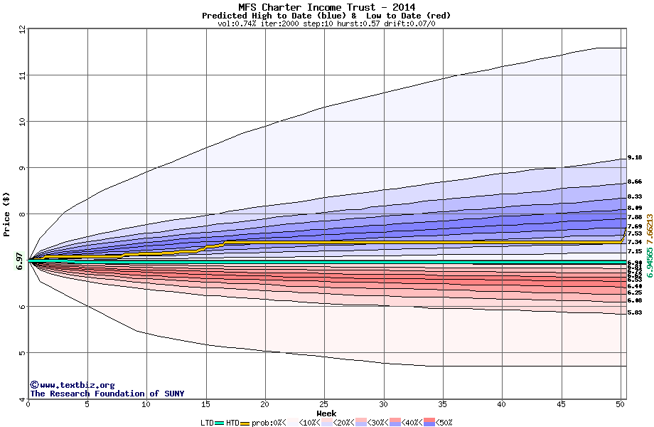 The high to date and low to date prices of the stock plotted against a random walk model for 2014 (what's this?).