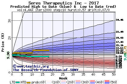 The high to date and low to date prices of the stock plotted against a random walk model for 2017 (what's this?).