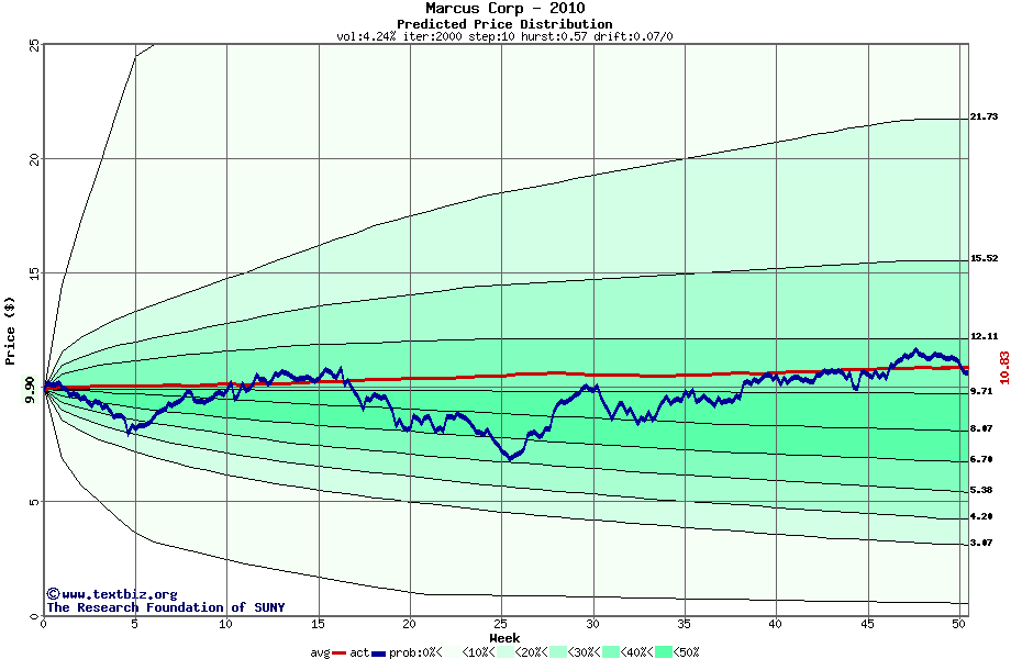 The following graph plots the year-to-date performance of the stock for 2010 compared to the probability calculated by a random walk model.