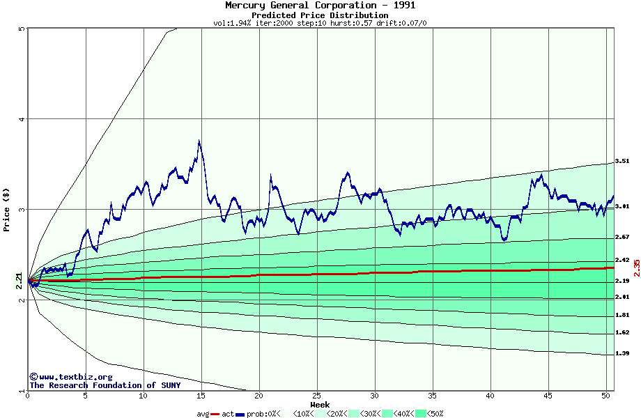 The following graph plots the year-to-date performance of the stock for 1991 compared to the probability calculated by a random walk model.