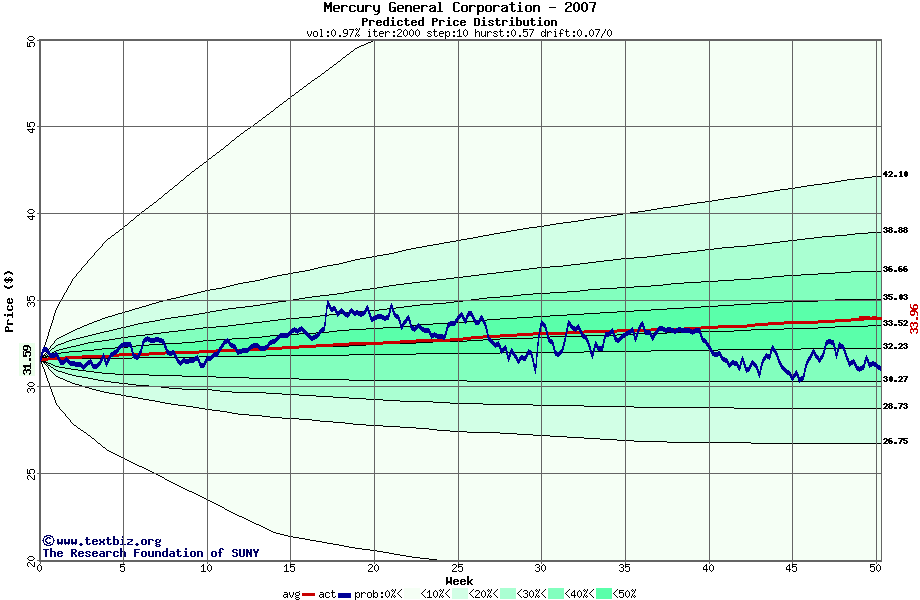 The following graph plots the year-to-date performance of the stock for 2007 compared to the probability calculated by a random walk model.