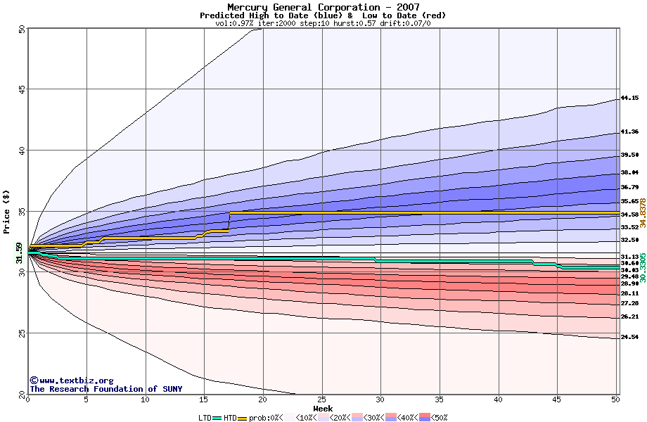 The high to date and low to date prices of the stock plotted against a random walk model for 2007 (what's this?).