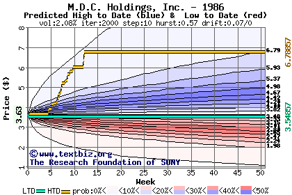 The high to date and low to date prices of the stock plotted against a random walk model for 1986 (what's this?).