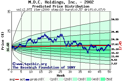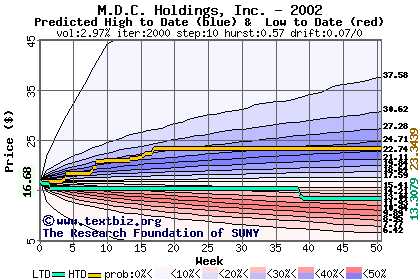 The high to date and low to date prices of the stock plotted against a random walk model for 2002 (what's this?).