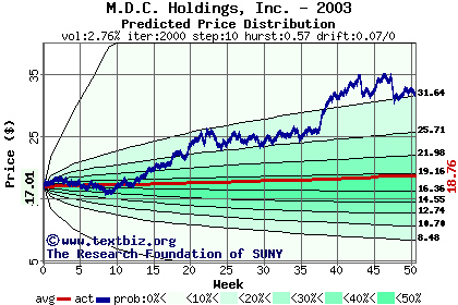 The high to date and low to date prices of the stock plotted against a random walk model for 2003 (what's this?).