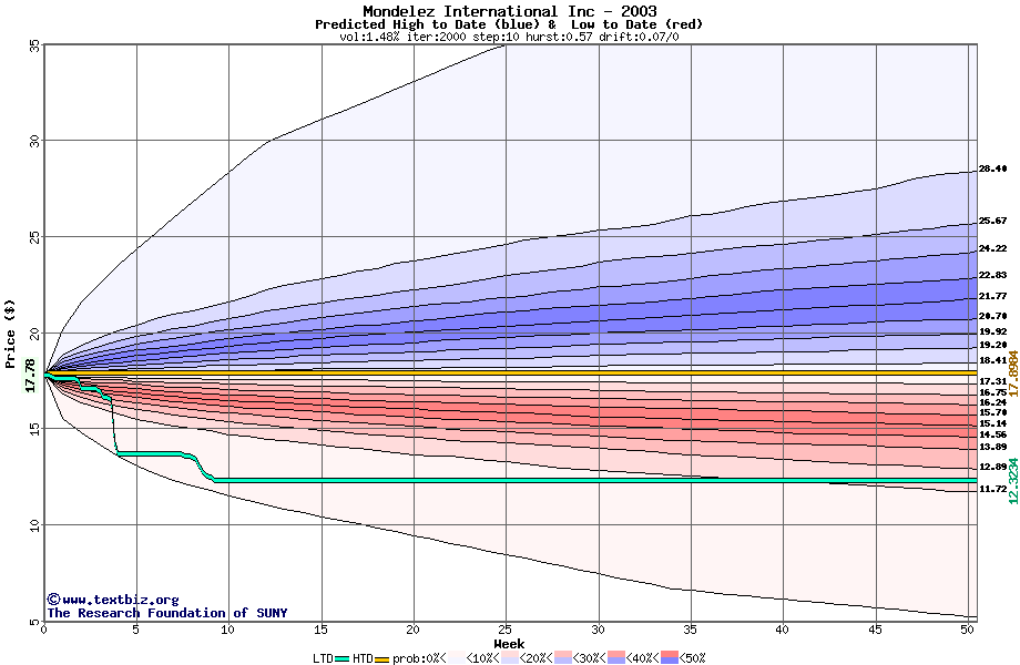 The high to date and low to date prices of the stock plotted against a random walk model for 2003 (what's this?).