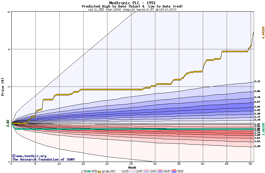 The high to date and low to date prices of the stock plotted against a random walk model for 1991 (what's this?).