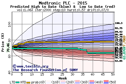 The high to date and low to date prices of the stock plotted against a random walk model for 2015 (what's this?).