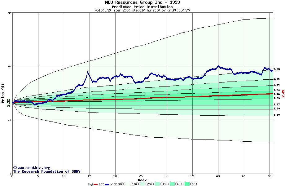 The following graph plots the year-to-date performance of the stock for 1993 compared to the probability calculated by a random walk model.