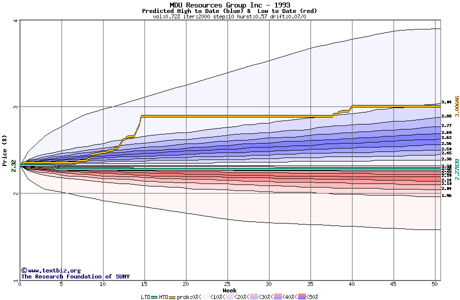The high to date and low to date prices of the stock plotted against a random walk model for 1993 (what's this?).