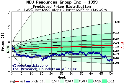 The high to date and low to date prices of the stock plotted against a random walk model for 1999 (what's this?).